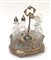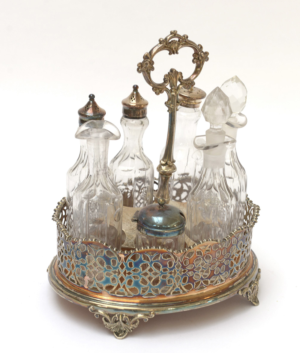 Cruet-stand in metallo argentato con ringhiera traforata e sette contenitori in vetro molato (difetti e mancanze)