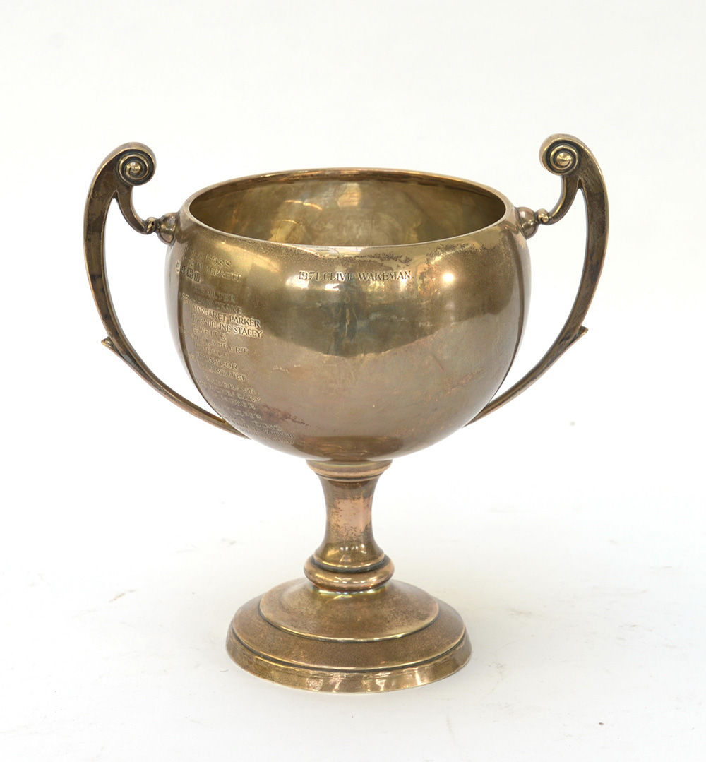Coppa biansata in argento di forma globulare con incisioni. Birmingham 1932 (gr 590 circa) (h cm 23, d cm 22) (difetti)