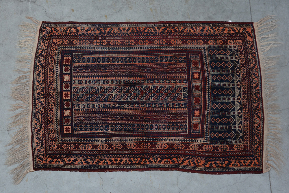 [Tappeti] Tappeto Afghan, sec. XX. Disegno geometrico nei toni dell'arancio, marrone e blu (cm 138x93)(difetti)