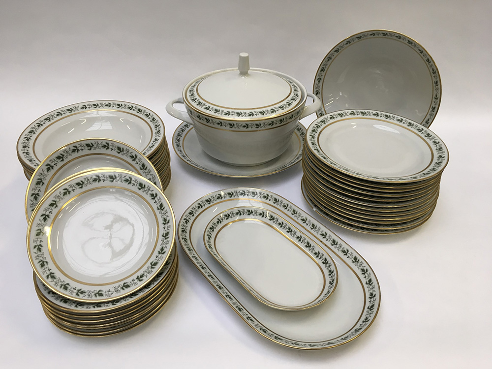 Manifattura tedesca, servizio da tavola in porcellana con profili decorati a foglie di vite e filettature in oro, composto da dodici piatti piani, dodici fondi, undici piatti per frutta, due piatti da portata ovali e uno tondo, zuppiera e insalatiera (difetti)