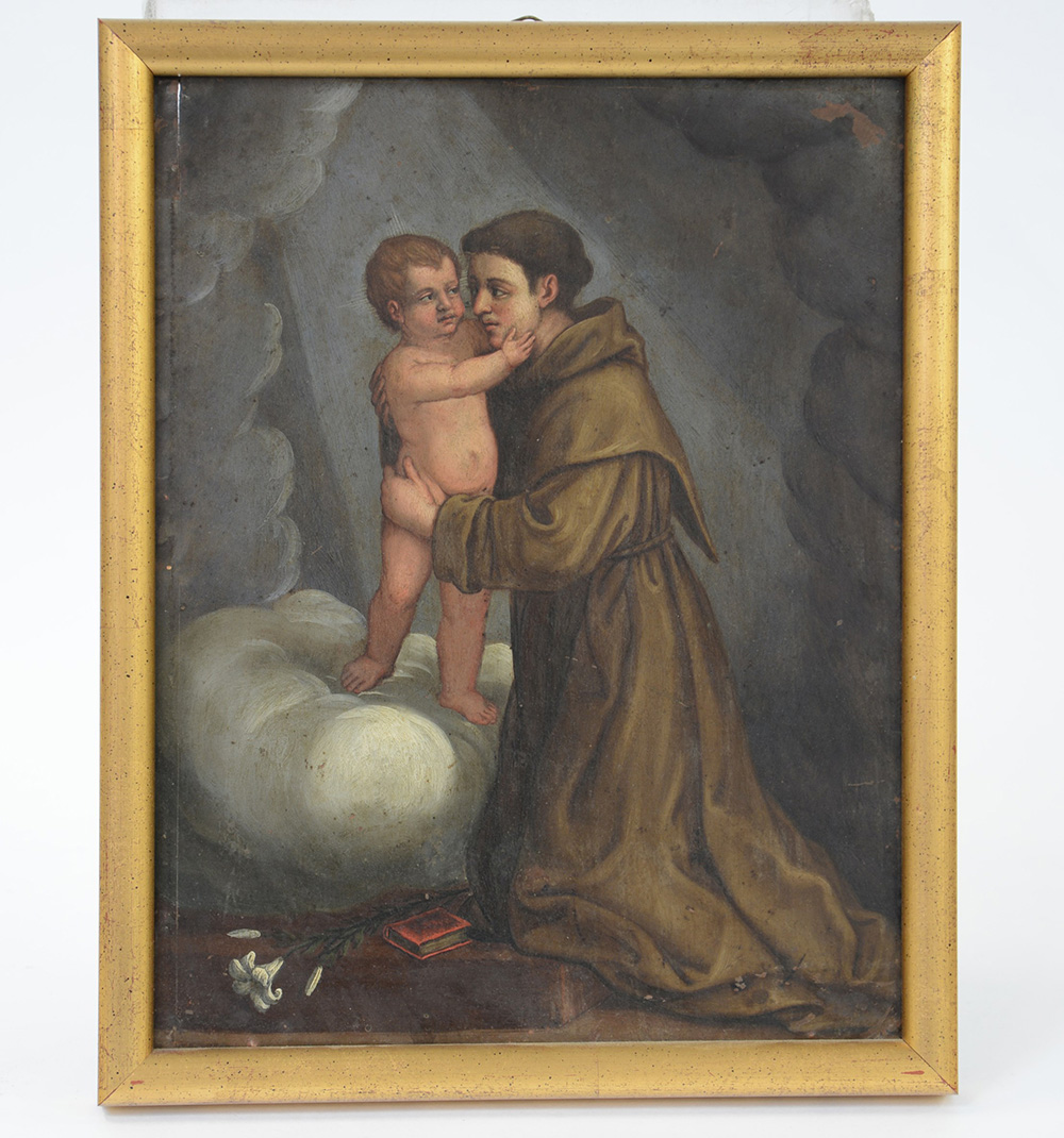 Scuola del sec XVIII "Sant'Antonio con Bambin Gesù" olio su rame (cm 30x22) in cornice (restauri)