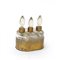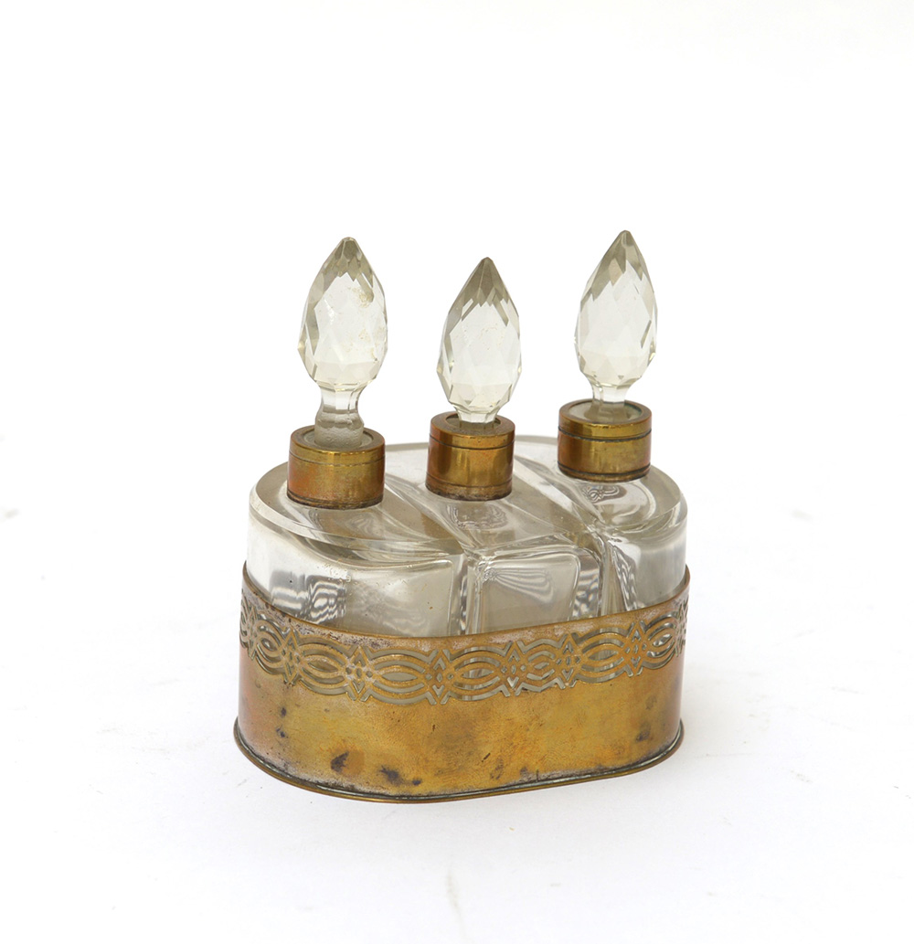 Set di tre bottigliette per profumo raccolte entro struttura in metallo con...