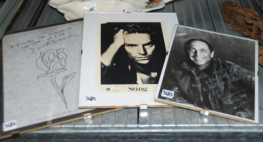 Lotto composto da una foto autografa di Sting e un disegno autografo di Donald Baechler dedicati a Krizia uniti ad un'altra foto con dedica.