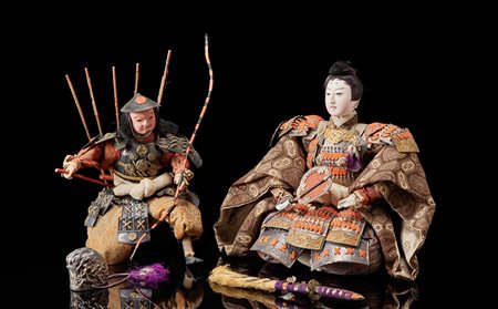 Manifattura giapponese "Samurai" Due statuette in legno e ceramica policroma con vesti e armatura in stoffa e metallo (difetti) -EN Two Japanese wood and ceramic Samurai dolls (defects)
