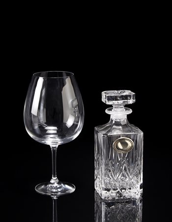 Lotto composto da una bottiglia in cristallo molato decorata con fregio in...