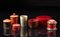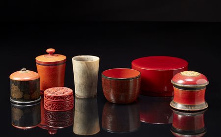 Manifatture diverse. Gruppo di sette bicchieri e scatole con coperchi in lacca e osso (difetti) -EN Different manufactures. Group of seven glasses and boxes with tops in lacquer and bone (defects)