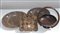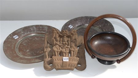 Lotto composto da una scultura indiana in legno raffigurante divinità, due piatti orientali in rame e un'alzatina in legno