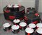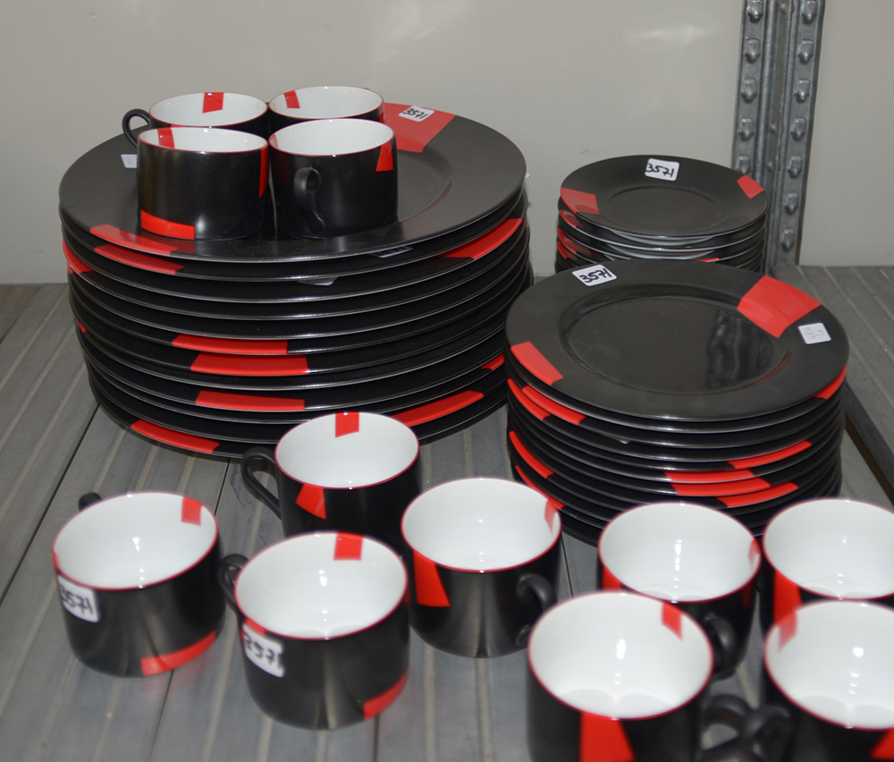 Manifattura Taitù Set da tavolo per dodici persone in porcellana decorata in nero e rosso a motivi geometrici, composto da tazze con piattini, piatti piani e piatti da dessert. San Marco 1985 (difetti) -EN Taitù manufacture. A twelve person porcelain dinner service (losses)