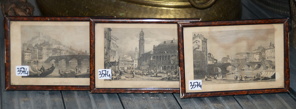 Gruppo di tre piccole incisioni del sec. XIX raffiguranti scorci di città italiane (cm 12x18) in cornici (difetti)