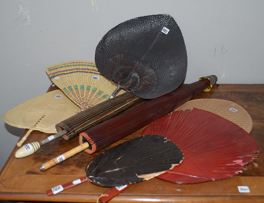 Lotto composto da otto fra ventagli e ombrelli di manifattura orientale...