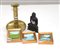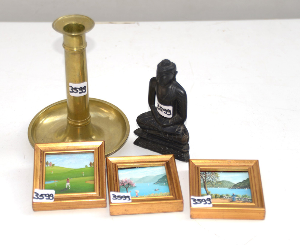 Lotto composto da tre piccoli dipinti, un candeliere in ottone del sec. XIX e una scultura lignea raffigurante Buddha -EN Lot comprising three small paintings, a brass candlesticks and a wooden Buddha sculpture