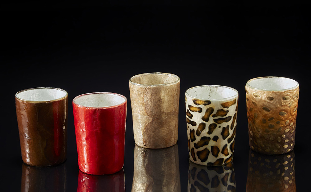Gruppo di cinque bicchieri in vetro a foglia d'oro a decori diversi -EN Group of five different gold leaf and glass vessels