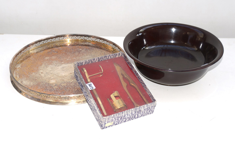 Lotto composto da un vassoio in metallo argentato, una fruttiera in mogano e un set da tavola