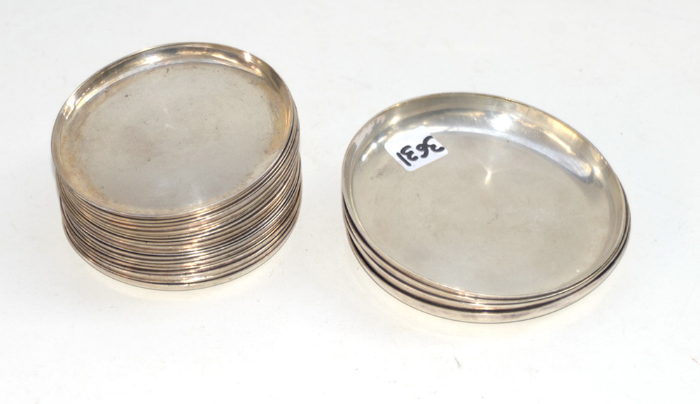 Gruppo di diciannove sottobicchieri e quattro sottobottiglie in metallo argentato