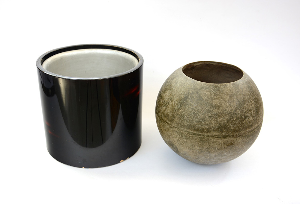 Lotto composto da un rinfresca bottiglie in lacca con vasca in alluminio e un vaso portafiori in materiale sintetico (difetti) -EN Lot comprising a wine cooler and a flower vase (losses)