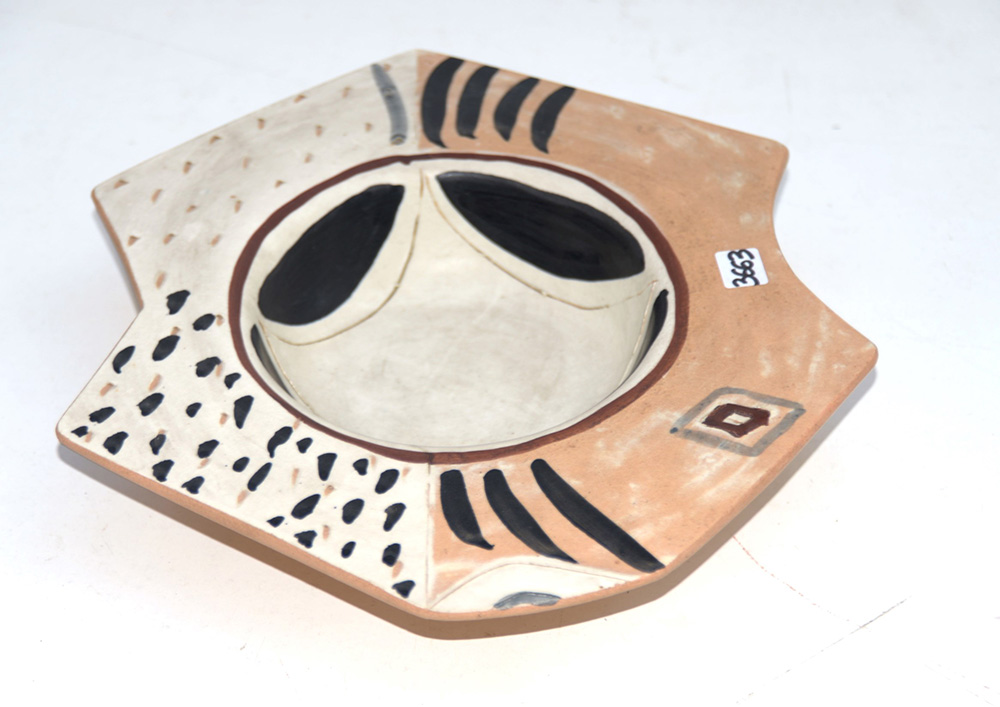 L. Fiume Piatto in terracotta di forma sagomata decorato a motivi stilizzati (cm 34x6x34). Marcata L.Fiume al retro