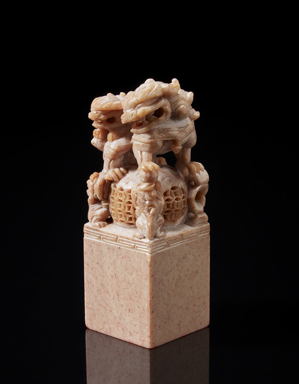 Sigillo in pietra dura sormontato da leoncini a tutto tondo (h. cm 14) Cina,...