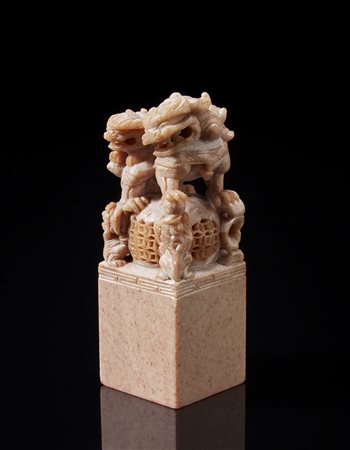 Sigillo in pietra dura sormontato da leoncini a tutto tondo (h. cm 14) Cina, sec. XX -EN A Chinese hardstone seal. China 20th century