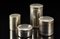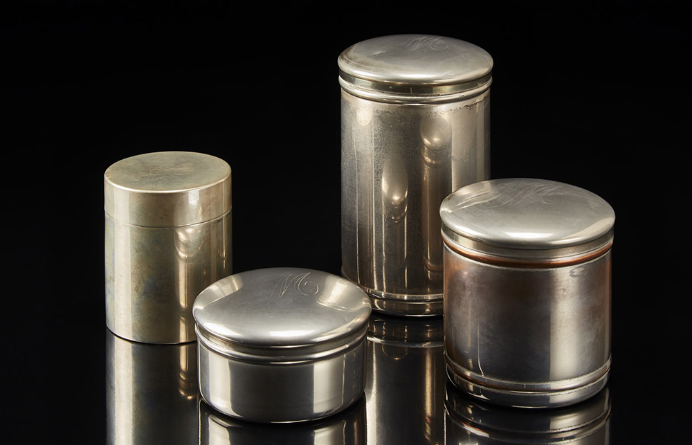 Lotto composto da quattro scatole in argento e rame argentato di forma cilindrica con coperchi cifrati (difetti) -EN Lot comprising four silver and silver-plated copper boxes with tops (defects)