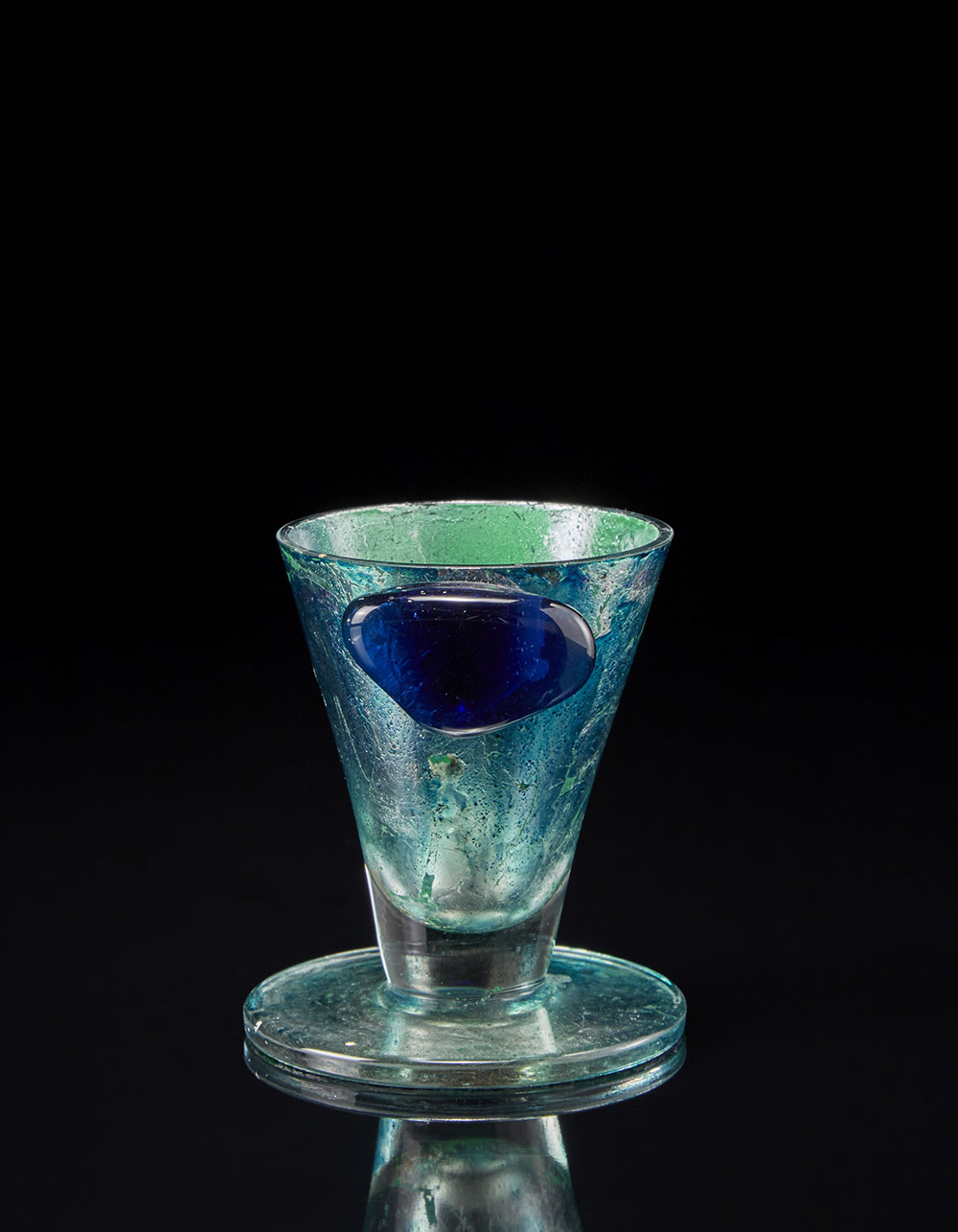 Vaso a calice decorato con applicazioni in pasta vitrea blu e smalti color argento, blu e verde. Sec. XX (h. cm 11) (difetti) -EN A chalice glass vase with vitreous paste applications. 20th century (defects)