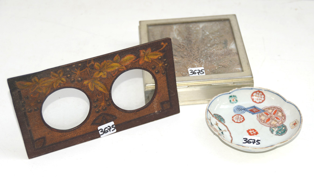 Lotto composto da una scatola in metallo argentato, una cornice portafoto dell'inizio del sec. XX e un piattino giapponese polilobato