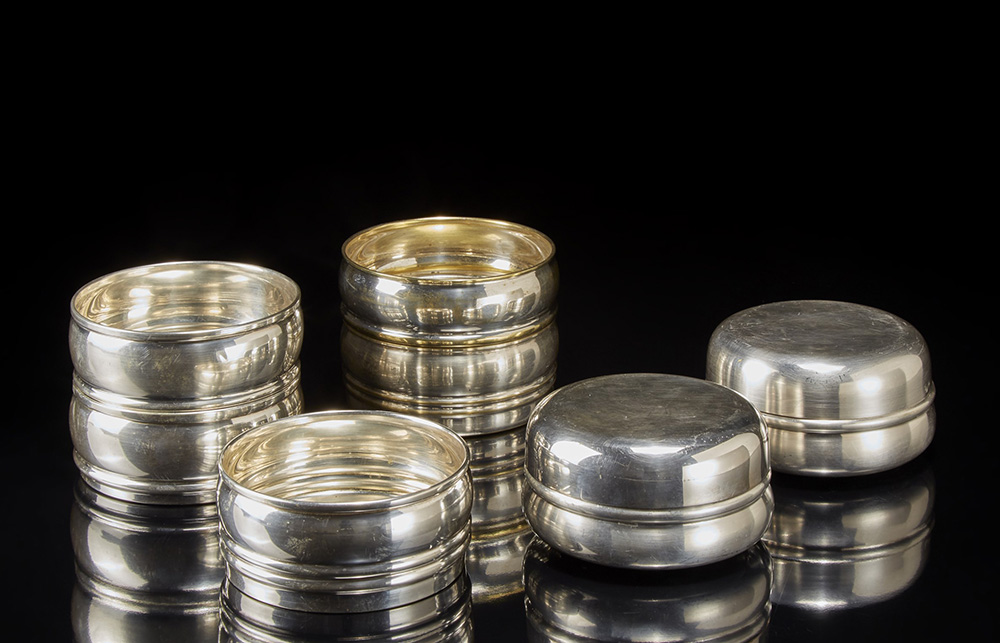 Scatola scomponibile composta da cinque ciotole ed un coperchio in argento e metallo argentato (gr. 600) (difetti) -EN Lot comprising seven silver and silver-plated bowls (losses)