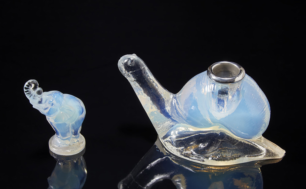 Sabino, Francia Lotto composto da una sculturina in vetro opalescente soffiato in stampo e molato raffigurante un elefante firmato e locato alla base, unito a un porta candela a forma di lumaca in vetro opalescente soffiato in stampo (difetti e mancanze) -EN Lot comprising a small opalescent glass elephant sculpture, signed and an opalescent glass candlestick (losses and flaws)