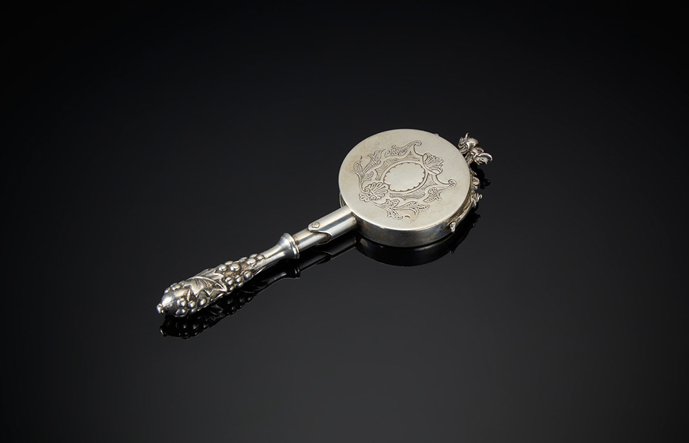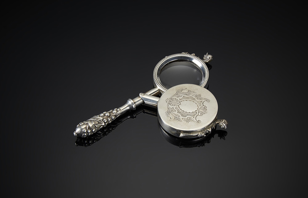 Lente in argento decorata a motivi stilizzati. Titolo 800 -EN A silver magnifying glass