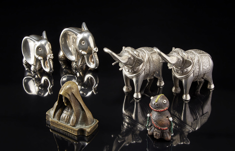 Lotto composto da: due elefanti orientali in argento, due in lamina d'argento, un piccolo idolo africano ed un piccolo busto raffigurante la madonna -EN A group of silver plated and metal sculptures