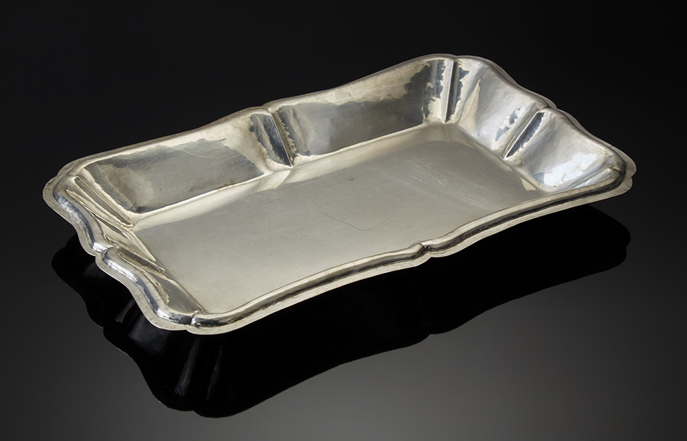 Centrotavola in argento battuto a mano con bordo mistilineo. Titolo 800. Argentiere San Donà Vicenza (cm 37x4x24) (gr 600 ca.) -EN A silver centrepiece. San Donà, Vicenza Silversmith