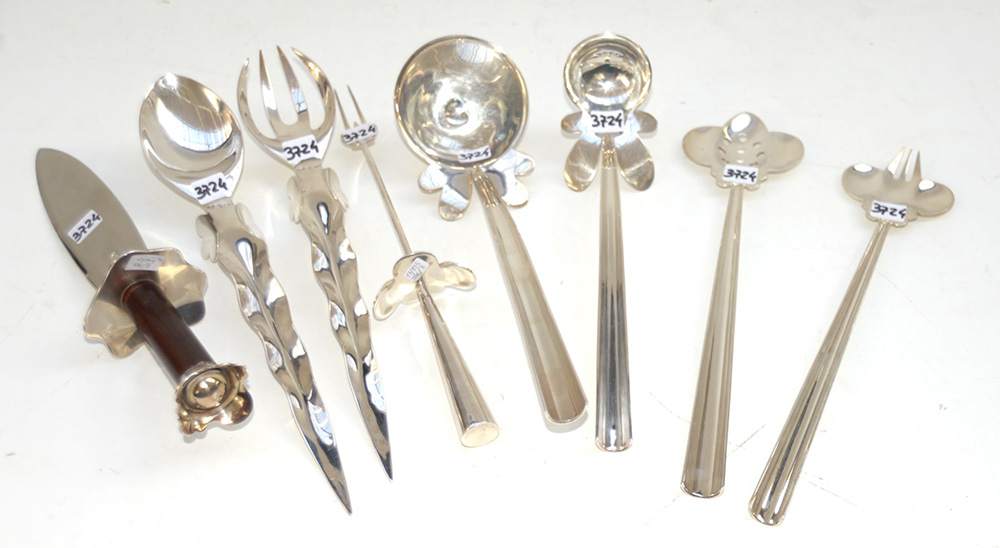 Set di otto posate da servizio in metallo argentato marcate Driade. Produzione recente. -EN Set of eight silver-plated serving utensils, marked