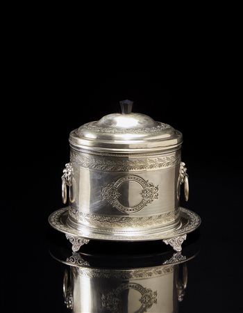 Biscottiera in metallo argentato e decorato a motivi stilizzati e volute. Presa in legno ebanizzato, anse ad anelli sorrette da teste leonine. Piedi sagomati Mappin & Webb 1940 circa -EN A silver-plated bisquit box with ebonized finial. Mappin & Webb, circa 1940