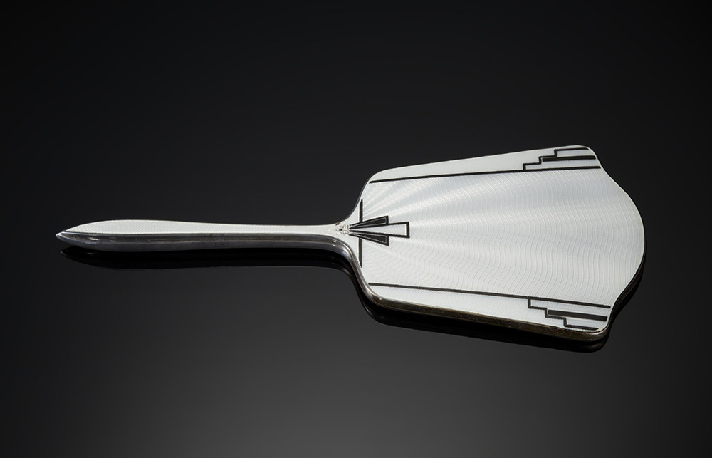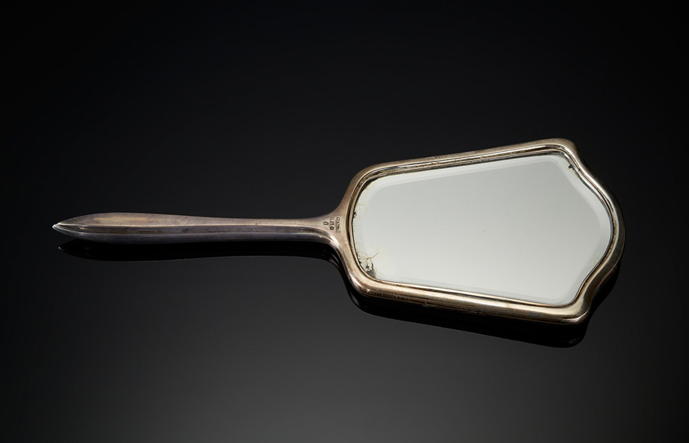 Specchio a mano in argento con corpo e presa decorati a guilloché e smalto traslucido. Birmingham, 1934 (lungh. cm 27) (difetti) -EN A silver hand mirror, Birmingham marks, 1934 (losses)