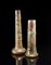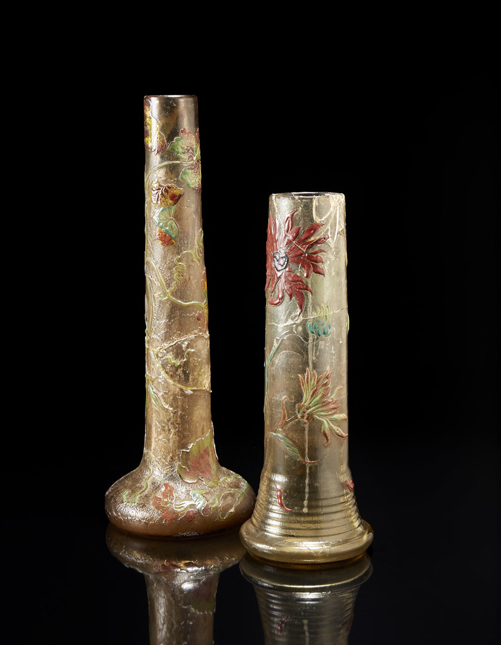 Gallé, Nancy Lotto composto da un vaso di forma cilindrica allargata alla base in vetro trasparente fumé inciso all'acido e decorato con crisantemi a rilievo con smalti policromi e oro e da un vaso analogo a motivi floreali. 1900 ca. (h. cm 36 e h. cm 46) (gravi difetti). Firmati "Gallé" alla giapponese -EN Lot comprising glass flower vase with crisanthemums and a similar vase , circa 1900. Signed (major defects)