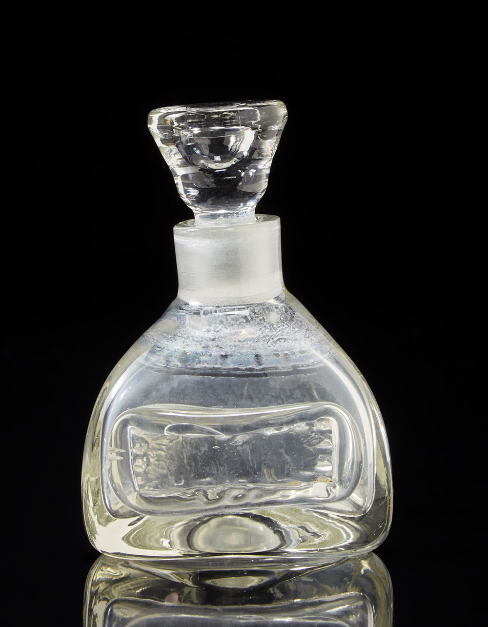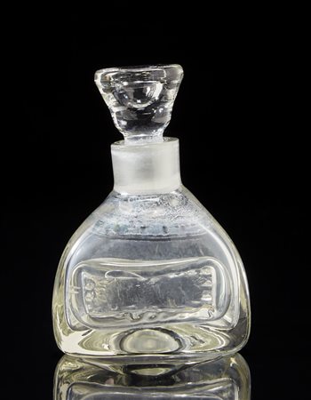 Bottiglia con tappo in vetro incolore di forma triangolare. Sec. XX (h. cm 16) -EN A triangular glass bottle and cover. 20th century
