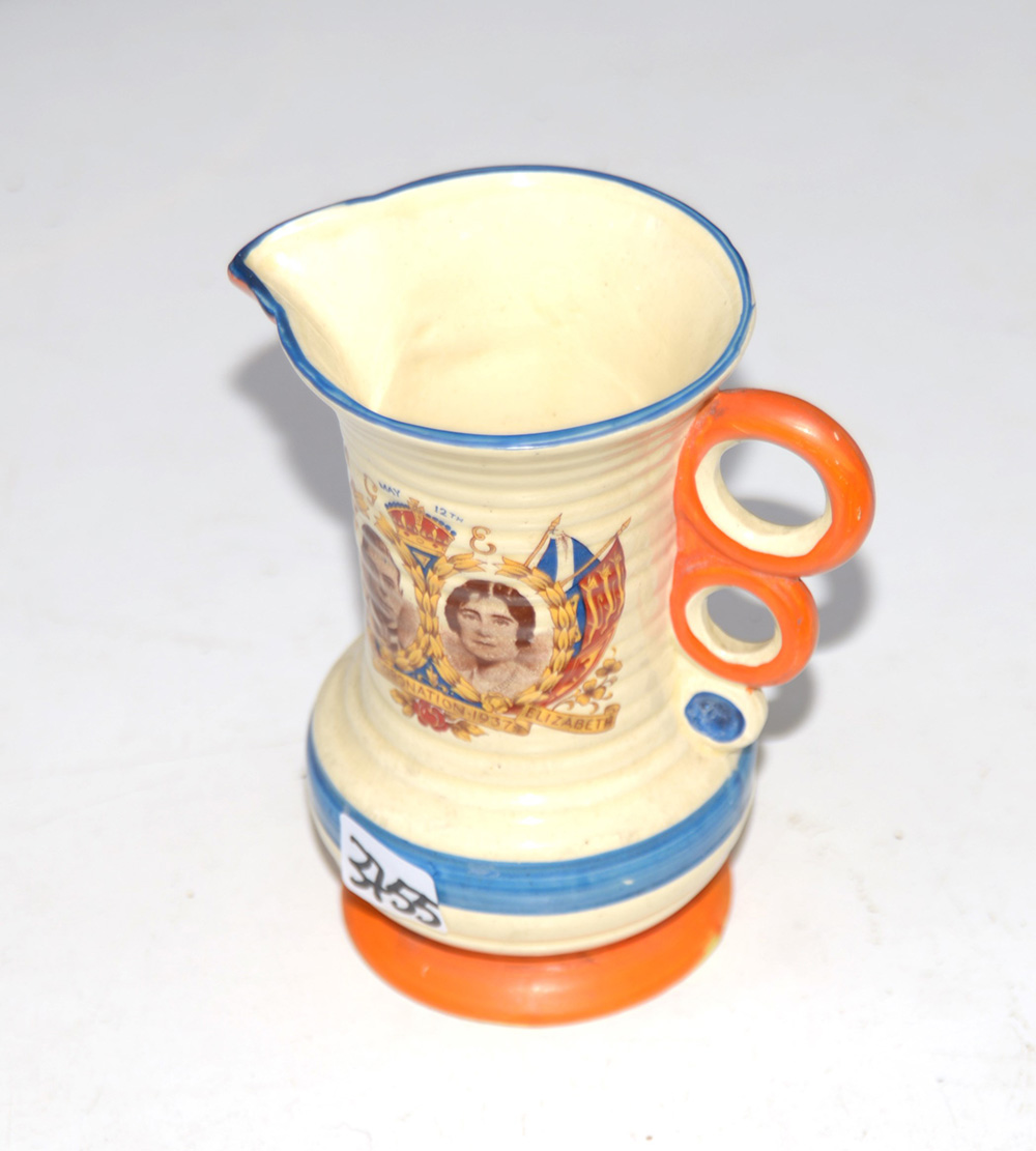 Manifattura inglese. Brocca commemorativa dell'incoronazione fra Giorgio VI e la Regina madre. In ceramica decorata in policromia e con presa stilizzata