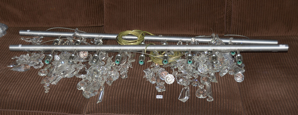 Nunzia Carbone e Tiziano Vudafieri Lampada a sospensione a diciotto luci della serie "Cellula". Produttore Anthologie Quartett, Germania 1996. Tubolare in alluminio naturale satinato, acciaio, pendenti in cristallo molato a mano (lungh. cm 240) (lievi difetti) -EN A " Cellula" suspension lamp. Anthologie Quartett production, Germany 1996 (minor losses)