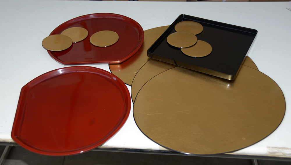 Lotto composto da diciannove fra piatti e vassoi in lacca in custodia e quindici sottobicchieri in lacca in custodia, di diverso decoro -EN Lot comprising nineteen dishes and trays and fifteen lacquered coasters