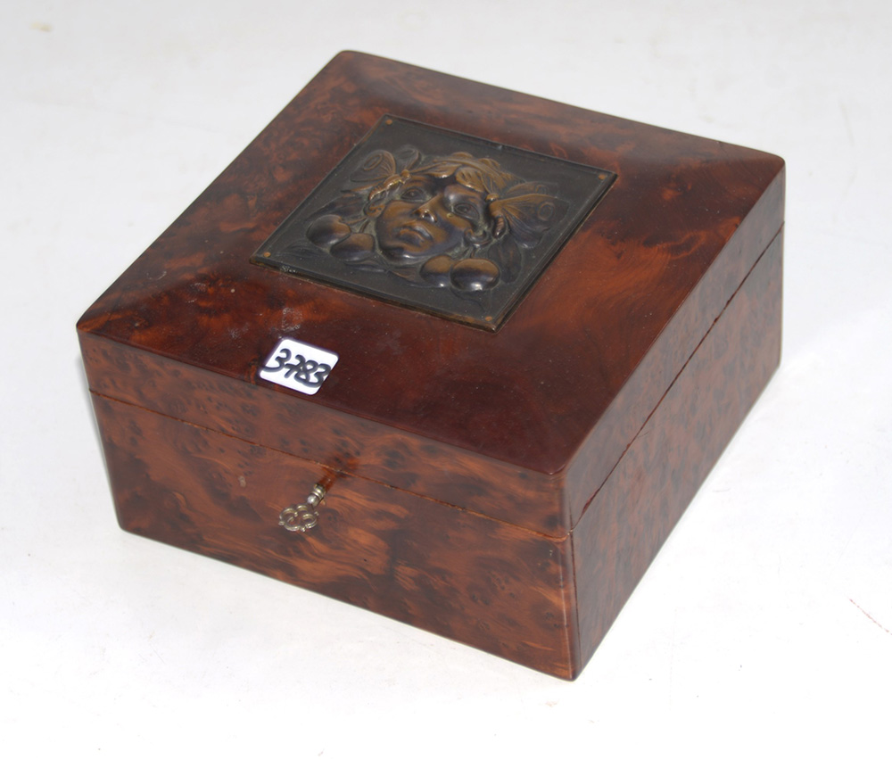 Scatola in radica con coperchio decorato da fregio in rame sbalzato con volto Liberty (lievi difetti)