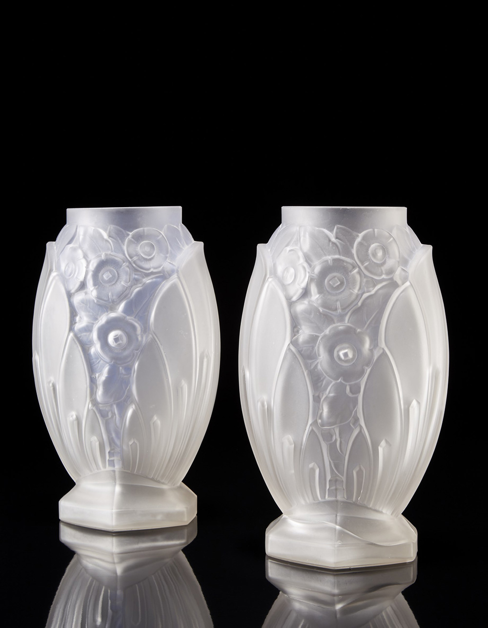 Muller Frères, Lunéville Lotto composto da due vasi in vetro in stampo e satinato decorati in rilievo a foglie e fiori stilizzati, base esagonale (gravi difetti) -EN Lot comprising two glass flower vases (major losses)