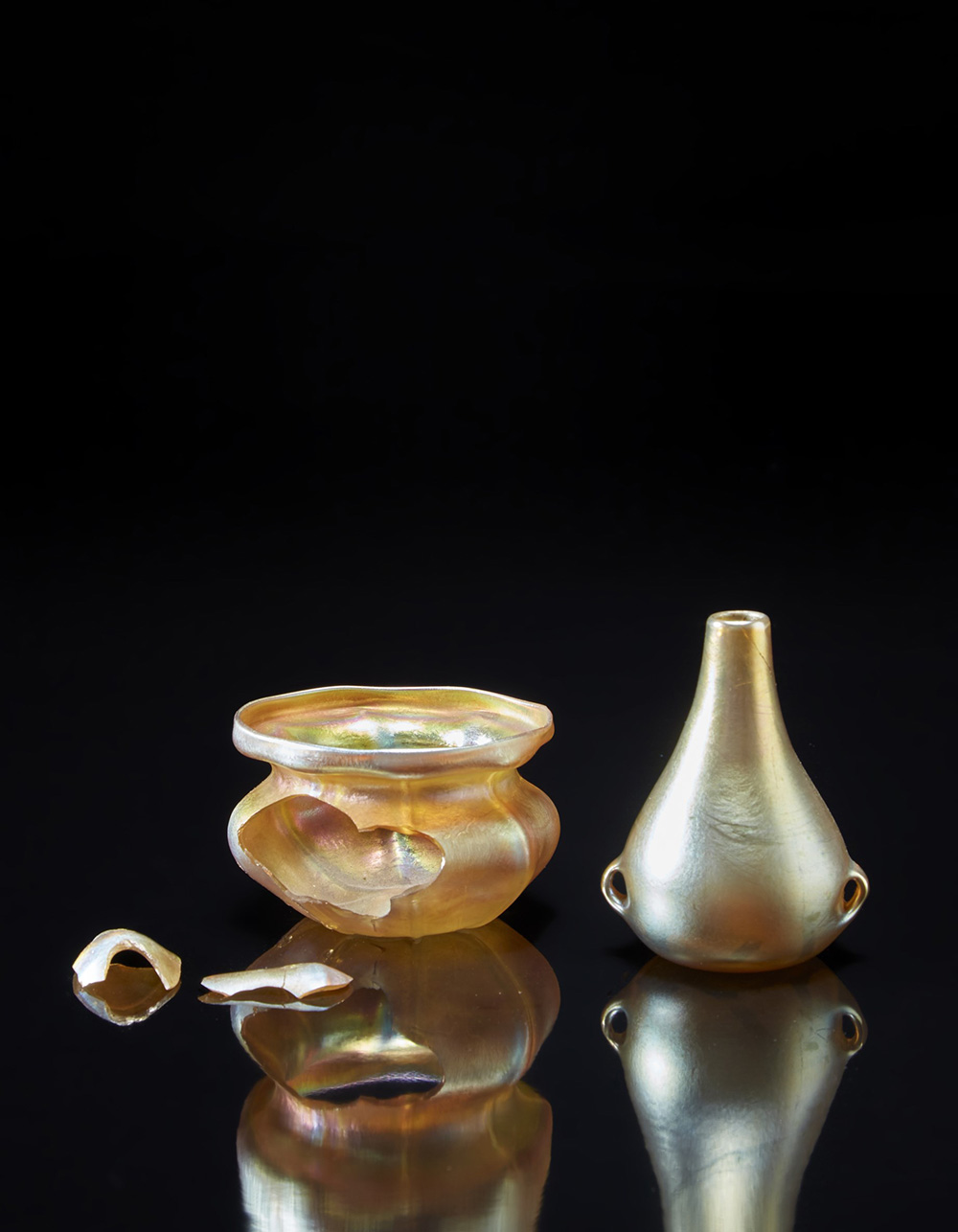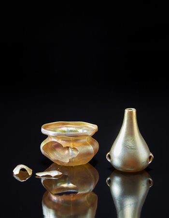 Due vasetti diversi in stile Tiffany, reca firma incisa alla base (gravi difetti) -EN Two different vases. New York, early 20th century. Signed (major defects)