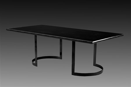 Tavolo con piano rettangolare laccato nero e gambe in metallo ad andamento semicircolare. Italia, anni 70. (difetti) -EN A black lacquer rectangular table. Italy, 1970's (defects)