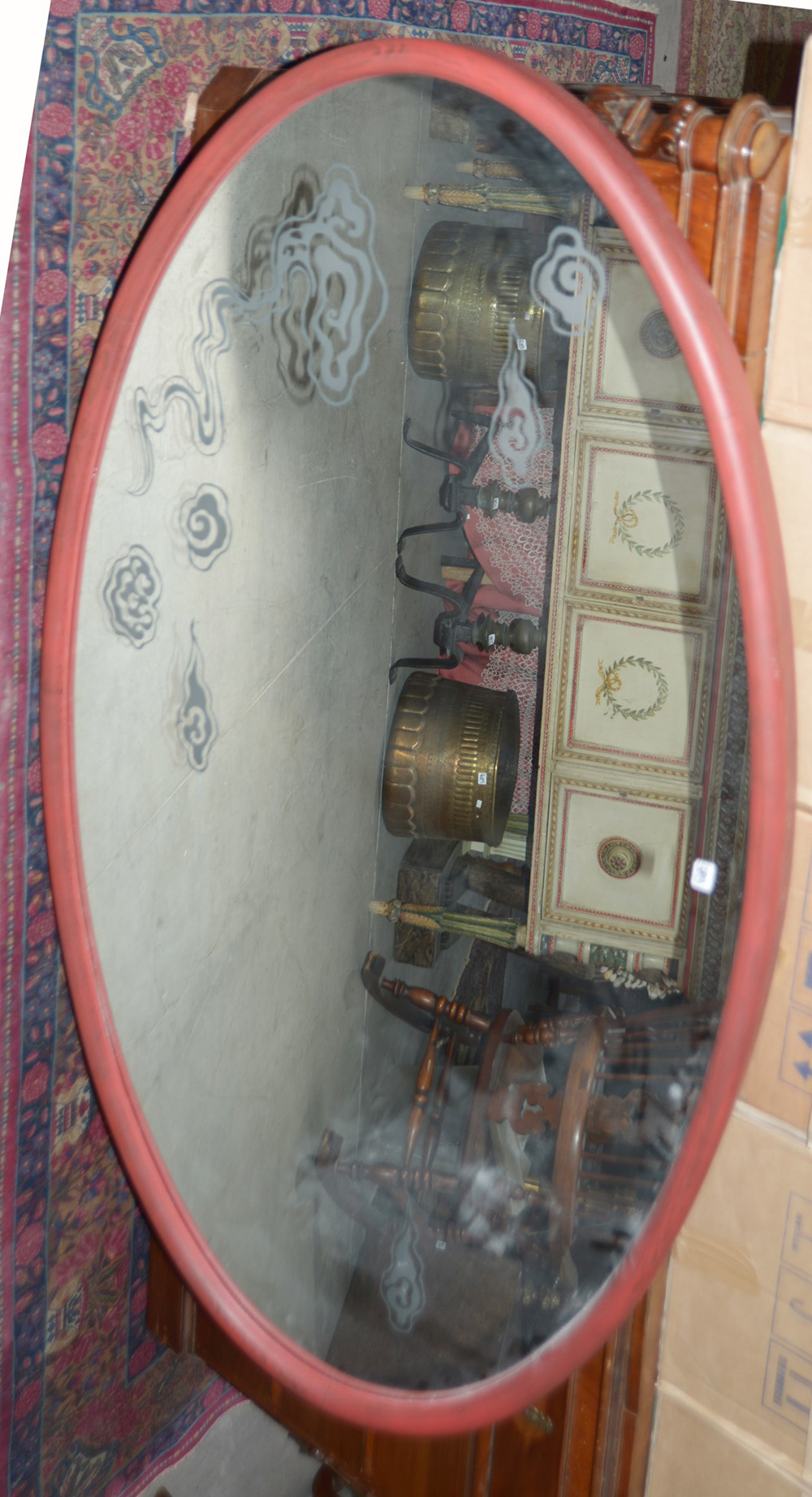 Specchio di forma ovale decorato a nuvole stilizzate (cm 145x85) In cornice in legno laccato rosso (difetti)