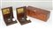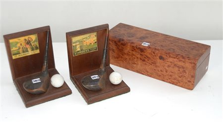 Lotto composto da due fermalibri decorati con mazze e palline da golf e una scatola rivestita in radica