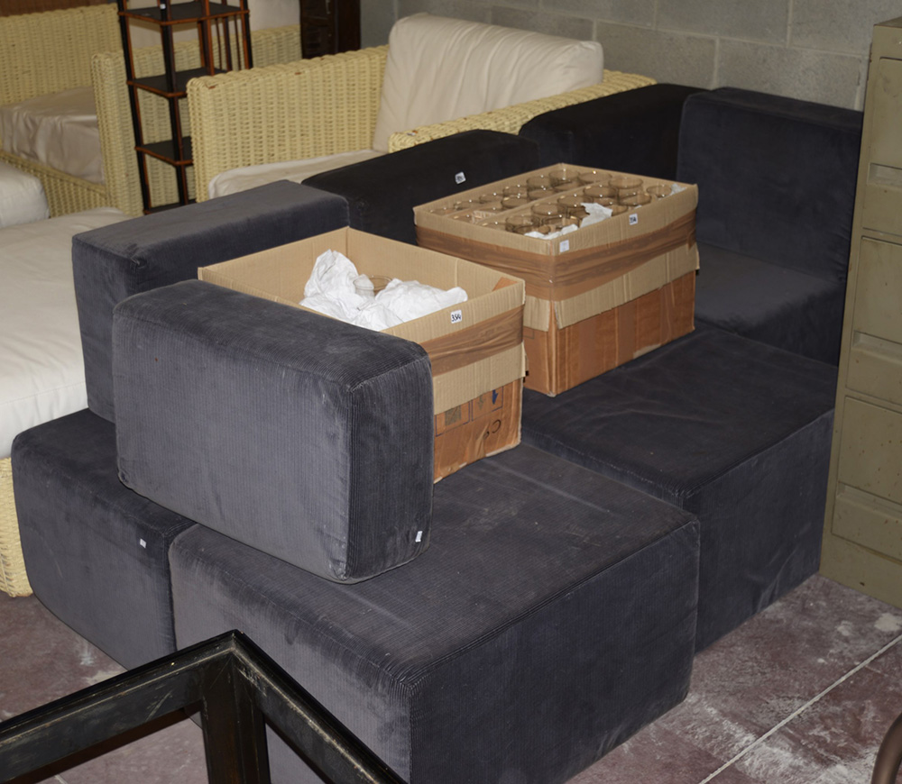 Divano a muro a cinque posti ricoperto in velluto grigio (difetti)
