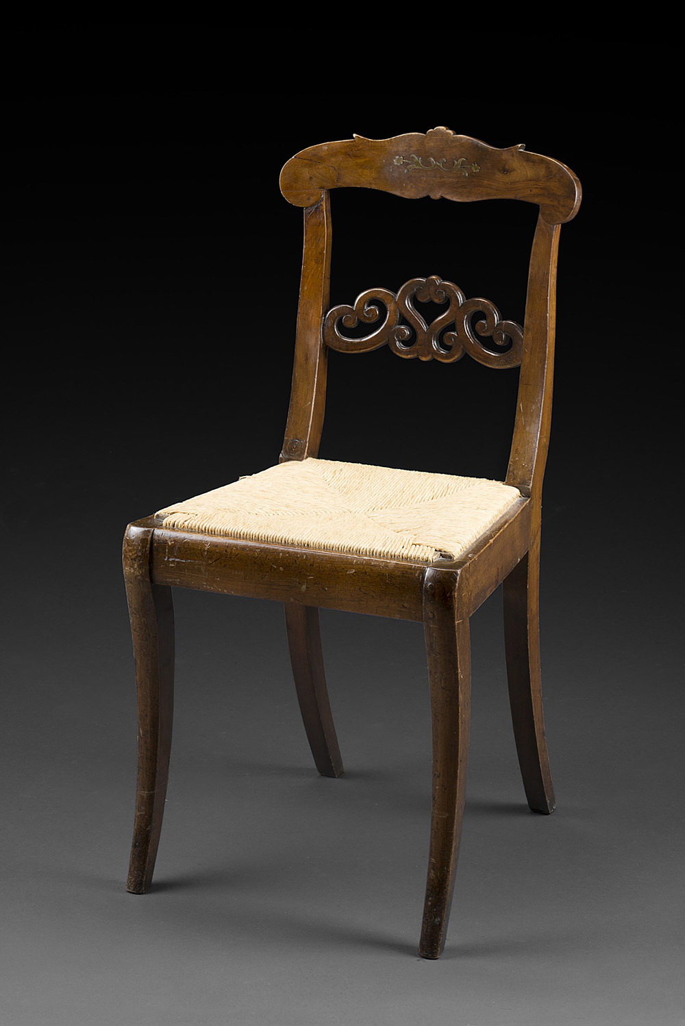 Sedia in noce con schienale a giorno intarsiato in ottone e intagliato a volute e riccioli. Gambe mosse. Sec. XIX (difetti) -EN A walnut chair, 19th century (defects)