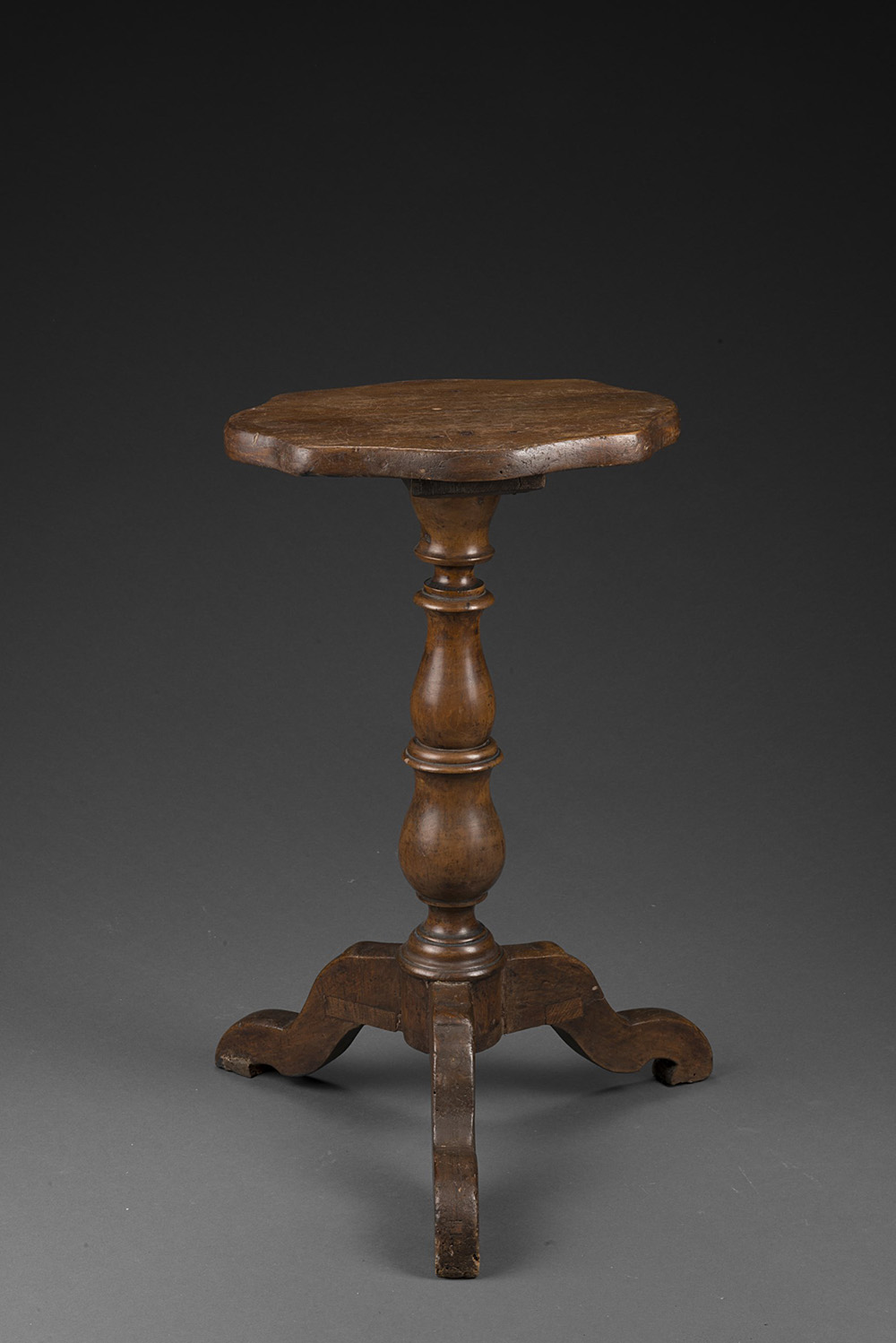 Tavolino porta vaso in noce con pianetto sagomato poggiante su gambe centrale tornita terminante a tre piedi sagomati. Sec. XIX (cm 42x73x33)