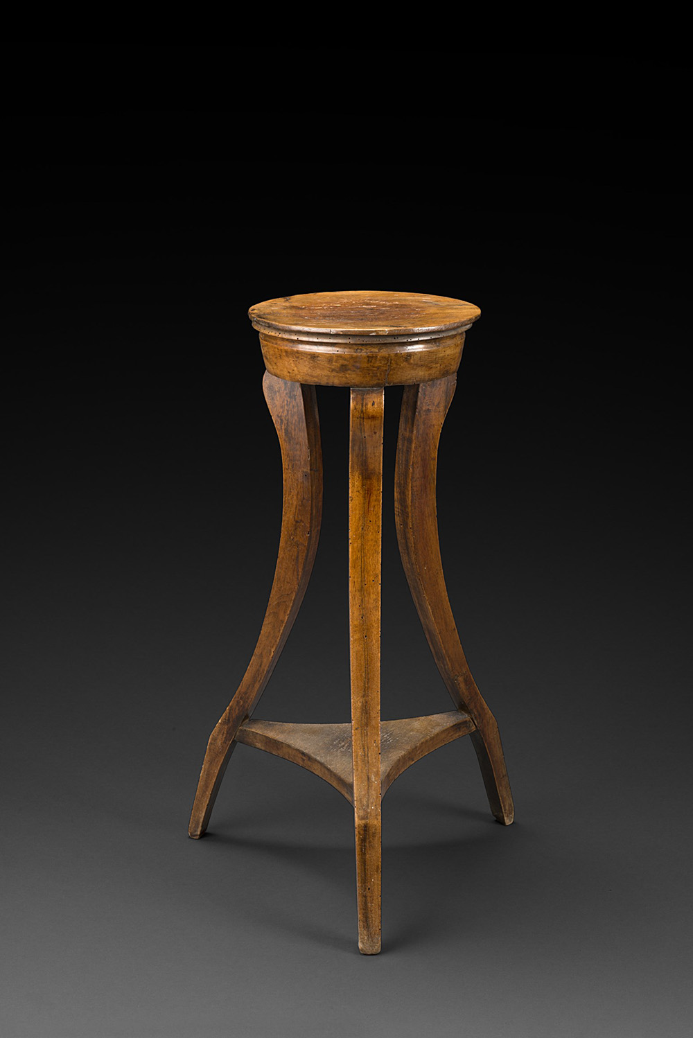 Base portavaso in noce con piano tondo sorretto da tre gambe mosse riunite da pianetto (h. cm 77x d. cm 29) (difetti) -EN A walnut vase stand (losses)