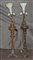 Coppie di lampade ad olio in rame con fusto a colonna poggiante su base tripode decorata a figure alate. Montata a luce elettrica in epoca posteriore (h. cm 110) (difetti)