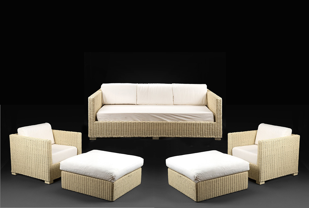 Fornitura da giardino in vimini composta da divano, due poltrone e due pouf....